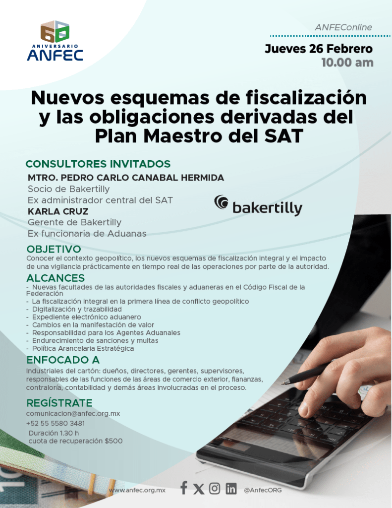 #ANFEConline #SAT #PlanMaestroSAT #Fiscalización #CumplimientoFiscal #ComercioExterior #Aduanas #Trazabilidad #Digitalización #ExpedienteElectrónico #ManifestaciónDeValor #AgentesAduanales #Sanciones #PolíticaArancelaria #ANFEC
